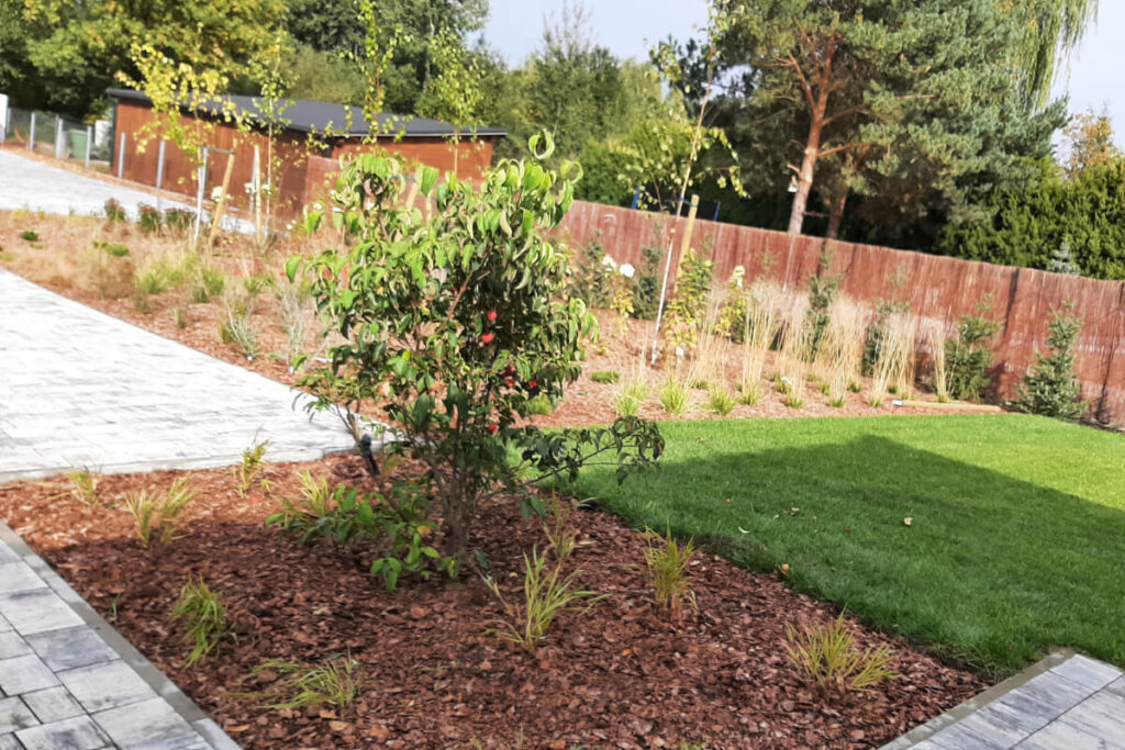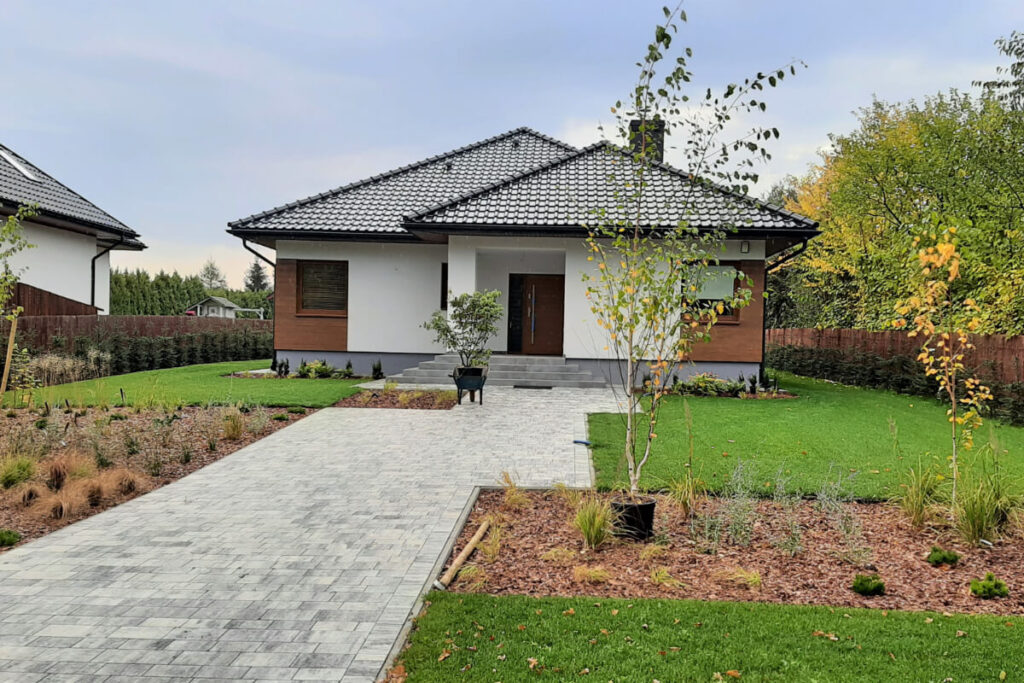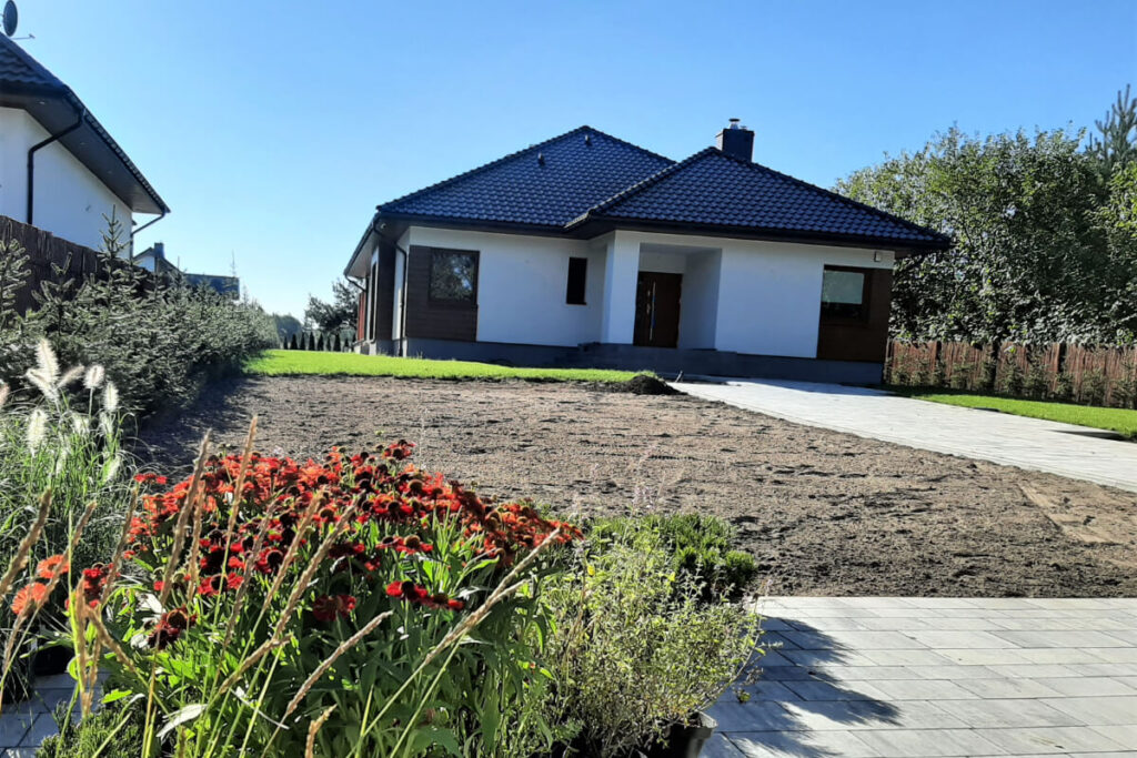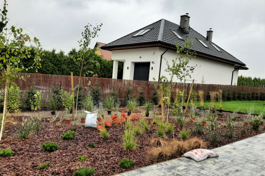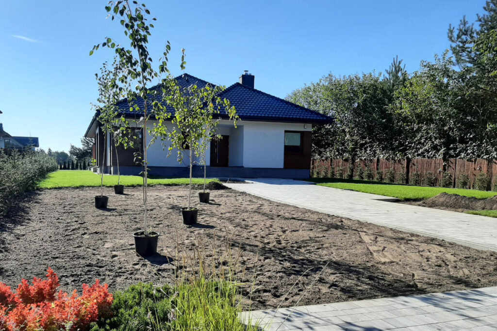 Ogród brzozowy to lekka, naturalistyczna kompozycja zbudowana wokół brzóz, które nadają przestrzeni charakter i delikatny, „leśny” klimat. Rabaty utrzymano w spokojnej palecie barw: dominują trawy ozdobne, byliny i rośliny okrywowe posadzone w większych, powtarzalnych grupach, dzięki czemu całość jest czytelna i uporządkowana. Szerokie trawniki i proste nawierzchnie podkreślają nowoczesną bryłę domu, a nasadzenia dobrze wyglądają przez cały sezon i są łatwe w pielęgnacji.